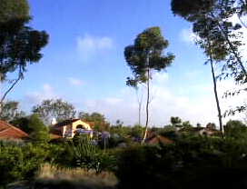 ジムさんの家はカリホルニア大学の敷地の中にあります。赤い屋根瓦のタウン・ハウス。4軒続きの中の1軒です。高台にあって庭からのながめは前方の家が一段低くなっていますから、緑の中に赤い屋根だけ見えて素敵です。丈の高いユーカリがさわさわと風に揺れて夜の9時ごろからの夕焼けが素晴らしく見とれてしまいます。 |