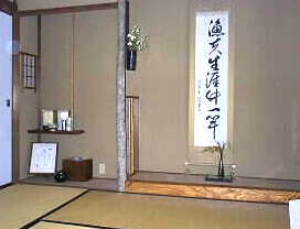 私たちが使わせてもらっている四畳半のお座敷です。違い棚にはお茶道具が飾られています。下の額は千宗室氏からの「オレンジカウンテイー支部顧問」の委嘱状が入っていました。右手は障子の出窓になっていて、棚にはお習字の稽古の道具が飾って置いてあります。 |