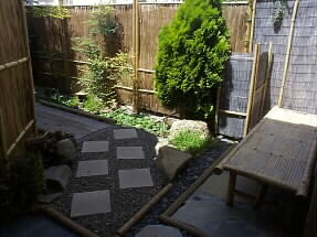 門を入るとジムさん手作りの池があって、ほてい草がたくさん浮いてその下から赤い金魚が泳いでいるのが見えます。池に影を作る橋を渡って玄関へ、お隣との境も芝垣風にしてあって、縁台まで置いてあり一歩門を入るともうここはジムさんの世界です。 |
