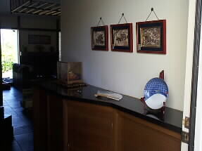 玄関ドアを開けて室内へ、西陣織りの絵が額に入っています。ケースに入った兜や有田のお皿、扇子が飾られています。 |
