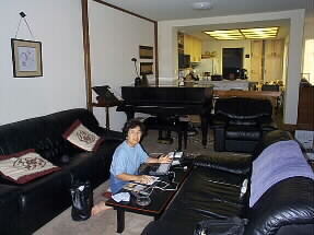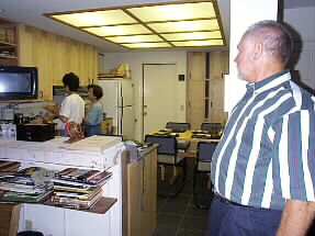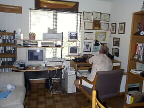 ジムさんの書斎、マックがドンと置いてあります。壁にはいろんな受賞、感謝状などが飾ってあります。窓の上のシップは息子さんがコンピューターの3Dから作ったと言うアメリカンズカップのヨットだそうです。私たちはこの部屋からインターネット接続をさせてもらっています。 |