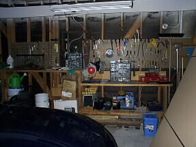 何でも自分で作ってしまうジムさんの仕事部屋?ガレージの壁です。いろんな道具が整然と置かれていました。主役の車はマツダRX7、そして今は動かないけれどご自慢のポルシェです。 |