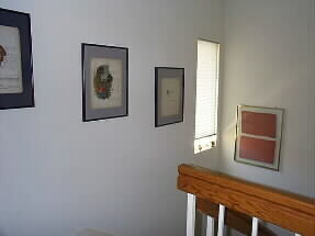 玄関横から2階へ上がりました。壁には100-150年前に印刷されたという美しい楽譜が何枚か額に飾られています。パシフイックコーラスの団員でもある音楽好きのジムさんの大事なコレクションです。 |