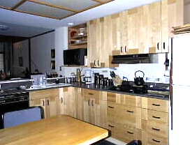 一人暮らしのジムさんはとてもお料理が上手で、器用に手早く料理をしては私たちにご馳走して下さいます。キチンも自分の使いやすいように色々と組み立てて作っています。吊り棚も流し下も全部自分で取り替えてしまっています。今はワインラックを壁面の隙間に組み込み中。また壁の色を塗り替えたいと、色見本を壁においてどの色がいいか研究中とのこと。本当に何でも自分でする国だなと感心をしてしまいました。 |