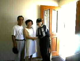 Mr. Okabe is a journalist living in San Francisco. He once made a speech in COARA meeting and stayed my house. We were very worry about him because he didn't come in time. After the entertainment was over, he finally appeared. He got a hard time to be involved in a traffic jam by caused by an accident. Mr. Sato, a newspaper reporter of the Asahi city editor's section, joined as well. We took a commemorative picture. Mr. Okabe wears sweater and Mr. Sato is in suite. |