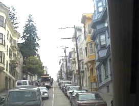 We wanted to talk much more, but as I was scheduled to see and enjoy a jazz live with another friend, Mr. Okabe, we left the Blades home and headed San Francisco. Blue sky in San Jose gradually turned into foggy weather. We arrived at "Foggy San Francisco" in an hour. As we approach the downtown, the housing becomes crowded. But as the coloring of wall or roof is regulated by a law to use light pastel colors, the appearance of the town gives us a uniformed impression. |