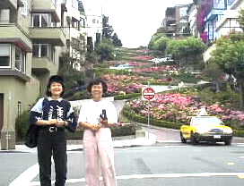 We passed famous slope called Lombard. A winding steep S-shaped road runs down through beautiful flower beds filled with full blossoms of hydrangea. Many tourist are vying with one another for taking pictures. |