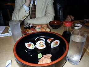 We changed the seat to an adjacent sushi room and talked much. This is the first experience for us to eat in a Japanese restaurant since we came to the USA. We took sushi dishes. In front of Mr. Sato is miso soup and a sushi set. In the front section of his dish is famous "California Roll", made from tuna and avocado. Others are "Rock'n Roll" sushi with many kinds of ingredient. Wasabi and ginger were tasteful as well. The seat of the room is dug so as one can stretch one's legs and leaning back to the seat. The room looked like just like Japanese, but beyond the room fitted with glass runs Amtrak trains. Yes, this is Oakland. Thanks to Mrs. Hideko's driving through the midnight highway, we could come back to the Blades home safely. |