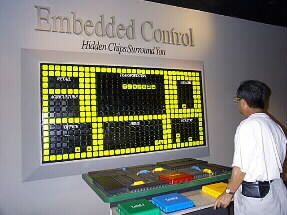 Just beside of the room is a display corner easily illustrating the history of the company. The corner was crowded with young visitors. This is an enlarged model of a chip. When you put green or blue chips into the grid, the panel pattern changes to illustrate how a chip works. Now, I have just put a red chip. |