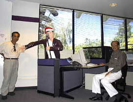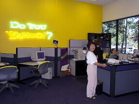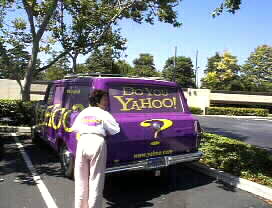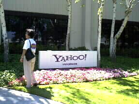 ![]() Yahoo's headquarter is in an office complex building. When I opened the door, such a yellow based coloring reception hall welcomed us. There are some personal computers. It seems that the symbol colors of the company are yellow and violet. I wonder what Mr. James was doing on the computer. He looked back in smile and winked, saying he just left the screen displaying my home page titled "San Jose Tour." The doll could be the president in his young days. | |