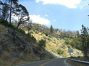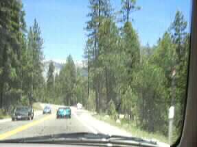 We passed an old gold mining site called "El Dorado." In gold rush days of the West, the town flourished by gold mining. San Francisco was constructed by the financial support of the gold produced here. The road became narrow and winding. We drove up along a clear stream that runs snow melted water of Shiera Nevada Mountains. |