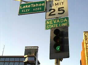 In the thick forest of pine and fur, there are many pretty motels and inns along the shore of Lake Tahoe. I found a traffic sign like this. Yes, I stepped in from California state to Nevada state. Our hotel stands a few feet inside of Nevada state. I was surprised to enter Nevada state so suddenly. |
