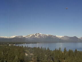 We left Lake Tahoe at 9:30 a.m. and headed San Jose. I felt very sad that I couldn't see the snow capped mountains and clear water of Lake Tahoe anymore. This is a picture of a red-and-yellow colored balloon high in the air towed by a boat.