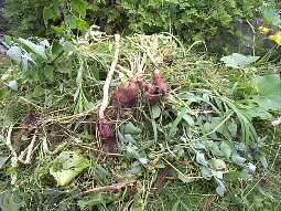 Yellow pumpkin flower is blooming as well. By the way, what is this red root? This is the result of overgrowing of radish. I have never thought that radish could grow up to this size. |