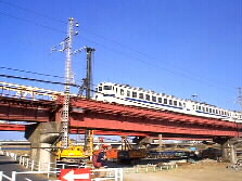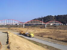 府内大橋の下流で河原の遊歩道が切れていました。丁度、今、作っている所です。芝生を植えた遊歩道が出来るようです。そこで私たちは土手の上の自転車道を歩きます。向こうの赤い橋のように見えるのは、水道です。 |
