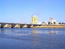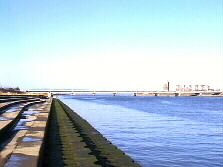 ![]() 向こうに見えるのは大分川の最後の橋、弁天大橋です。その先はもう海です。滝尾橋と弁天大橋の間は、水際公園となっていて、春は流し雛、夏は花火大会、といろんな行事の行われる所です。カヌーに乗った親子がのんびりと川遊びをしていました。