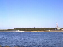 弁天大橋をくぐって、対岸には、ホーバー乗り場があります。丁度、大きなエンジン音を立てて走ってきたのは、大分空港から来たホーバーでした。今からホーバーは陸地に上がる所です。 赤い煙突のあたりは大分工業地帯です。新日鉄や九州火力、昭和電工、住友化学などの工場群があります。 |