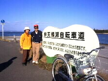 今日、私たちが歩いてきたのは、「弁天横瀬自転車道」という名前がついていました。記念写真を撮りました。 |
