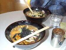 |  | 温泉から上がって休憩室で昼食を食べました。夫は山菜うどん、私はきつねうどん、どちらも400円でとってもおいしくて汗をかいてしまった。本当にあったまりました。 |