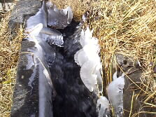 |    「ほていの湯」を出てまた車を走らせていると、たんぼの畦から流れて来る水路にこんなガチガチの氷が出来ていました。流れ落ちる水は半分氷柱になっているみたいです。見ているだけでブルブルです。道の横も真っ白な雪です。 | |