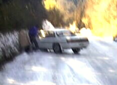 |    しいたけのホダ木の並んだ杉林の道も雪で真っ白、その日陰になった道路はちょっと凍っているようです。と車が止まっています。カーブした道の向こうへ歩いて行ってみました。ナント、スリップした車が溝に突っ込んでいます。その向こうにももう1台、白い車が溝に右半分落ちてしまっています。人はいません。手前の車は何台かの車から人が出て押し上げました。手伝った夫は、「もうここで今日はお終い」と言ってUターンをして帰ることにしました。 | |