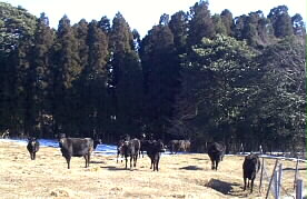 |  | 急に後ろが賑やかになりました。丁度、牛が散歩のために牛舎から出てきた所でした。おじさんに追われて、ピョンピョン跳ねながら出てきて日光浴をしていました。 |