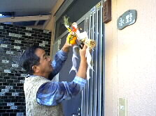 |  | 日本のお正月では門の両側に門松を立てるのが習わしでした。門松は字の如く、門の前に松とおめでたいとされている、若竹、梅を立てて清めとするものです。しかし、もうずっと前から普通の家では簡略化されてきています。木を大切にするということもあります。今では市役所が門松の絵を画いた紙を各戸2枚づつ配ってくれますので、それを貼り付けて代わりとします。 我が家は玄関に1枚、昨年末に取り付けた庭の入り口の扉に1枚、貼りつけました。それも今日は剥がしました。 |