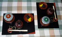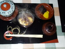 |  朝からストーブの上でコトコトと煮ていた小豆が柔らかくなっていい匂いがしてきました。お砂糖を入れてぜんざいにします。お餅が焼ける間にテーブルセッティングです。ふたつきのお椀を出してきました。箸休めには塩昆布とたくわんです。ぜんざいのお鍋に塩をほんの少し加えて、さあ、出来上がりです。 | |
