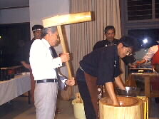 |  | 会場はたくさんのお料理が並びました。またお餅つきも行われまして、中谷さん、溝口さんのお二人も杵を持たれました。私たちは、搗き立てお餅の入ったおぜんざいを頂きました。 |
