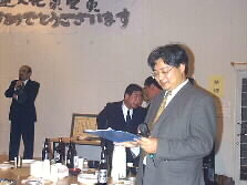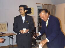 |  | 30代の頃からのお二人を知る方々が当時のエピソードを話されたり、これからも元気でこの町を引っ張っていって下さいという挨拶があったり和やかなパーテイーです。乾杯の後、湯布院町長の吉村氏と談笑される中谷さんです。 |