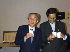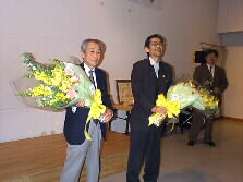 |    湯布院の溝口薫平さん(左)と中谷健太郎さんが、昨年暮れに運輸省の「交通文化賞」というのを受賞されました。これはご両人が永年、湯布院の観光事業と地域活性化にご努力されそのことが、交通文化の向上に大きく寄与したということに対して与えられた、とても名誉ある賞です。そして今夜、ゆふいん健康温泉館で、盛大な祝賀パーテイーが開かれました。お喜びのお二人です。 | |