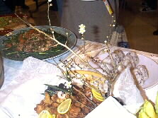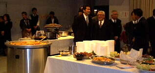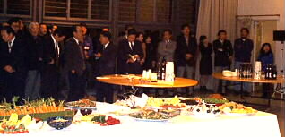 |    会場は100人余の人達が集まって終始笑い声の絶えない和やかな集まりでした。たくさんのお料理が並んでいます。左の大きな大きな直径1mもありそうな大鍋では、おでんがグツグツとおいしそうに煮えています。 | |