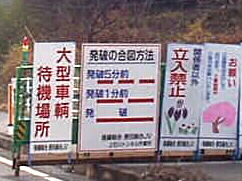 |    田尻ニュータウンの西を流れる田尻川を溯り、霊山(りょうぜん)のふもとの上白川地区へ差し掛かると、こんな看板がたくさん出ています。そうです。今日の目的地、上白川トンネル工事現場に着きました。「発破の合図方法」という看板(右写真)にはやはり緊張します。 | |