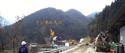 |  工事の皆さんの休憩所などの建物のある所から、工事の全景が良く見えます。中央がトンネルの入口、左下は、トンネル内から出た山土を埋めているたんぼです。この道路は、大分県大野町に通じます。くねくねと曲がった危険な山道だったものをトンネルを通して広い道にしようとしているのです。 | |