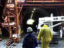 |  | トンネルの入口には、スライドセントラルという、大きな機械が置いてあります。この機械が、レールの上をモーターで動いていって、トンネル内のコンクリート工事をしていきます。 |