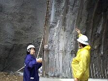 |  | トンネルの内部は、半径方向に長いボルトがたくさん打ち込まれています。また、入口付近は弱いので、半円状の鉄骨で補強されています。加藤さんの前の方の壁にはその一部が見えます。今からこれを支柱にして天井にも鉄骨をわたします。素人の私たちにも分かるようにとても丁寧に説明して下さいます。 |
