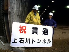 |    こんなものを見つけました。昨年のクリスマスの日に貫通式があったそうです。発破で小さな穴が向こう側に貫通してから2ヶ月後のことだったとか。右はトンネルを出た崖です。上に見えるのは、旧道の名残です。 | |