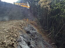 |  | 全長143メートルのトンネルを抜けました。ゆるくカーブしているし、7度の登り勾配があるので、工事はやはり大変だったということです。 「トンネルを抜けるとそこは雪国だった、、、、」(川端康成)ではなくて、そこは断崖だった。まだ道が無いのです。竹薮の向こうの山まで、橋になるのか、道路になるのか、まだ分からないとのこと。 |
