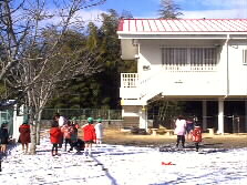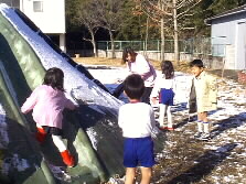 |    我が家のすぐ側の富士見が丘幼稚園から子ども達の元気な笑い声が聞こえてきました。積もった雪に顔を押し当てて、「これが鼻、これは口」と騒いでいます。そして早速先生と一緒に雪なげが始まりました。本当に子供は「風の子」ですね。 | |