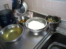 As my husband has been rather busy last one month, he couldn't join the cooking class for men. Today, he will challenge what he has learned last week - hard boiled rice with edible wild plants. First, three cups of Mochigome (a kind of rice specially grown to make rice paste) is washed and drained on the sieve. Then prepare the secondary stock from kelps and dried bonito shavings (first stock will be used for making soup.) The ingredients to be added to the rice are edible wild plants and boiled Adzuki beans. The edible wild plant was purchased at a super market as a package. It must be carefully rinsed with fresh water so as to remove any possible bleaches. The package contained bracken shoots, bamboo sprouts, and Jew's-ears. Carrots and soaked dried mushroom will be added as well. |