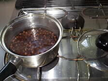 In the cooking class, canned beans was used, but this time we cooked from dried beans. The first boiling water is to be drained to remove harshness. Then the beans are simmered until they become soft. If water evaporates before the end of the simmering, a little amount of water is to be added. |