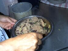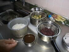 Three cups of water soaked Mochigome is put into a electric cooking pod together with total 350 ml of soup (150 ml of simmering drainage of Adzuki beans, and 200 ml of second stock.) After steam comes out of the cooker, Adzuki beans and edible wild plants are added into the cooker for further cooking. |