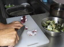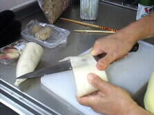 He tries "Catsup-muki", which slices the skin of a horse radish to the tangential direction by moving a cooking knife back and forth in axitial direction. It is not so easy to slice out a thin paper-like skin, without giving any damages on it. He wishes the knife cuts well. |