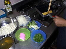 Today's main dish is Japanese noodle with ground horse radish. All the ingredients are ready to be mixed. Before serving, he has to prepare an omelet to be assorted to the noodle. He failed in making an omelet in the class, but this time he did very well. The noodle is cooled well and added with soup taken from stock. |