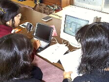 |  | 「フローッピーはここへ入れるのよ、パソコンの中には何が詰まっているのか、それを一覧で見せてくれるのが、このエクスプローラー、ほら、ここに、家計集計に使う表が入っているって分かるでしょう?」皆で頭を寄せ合って、個人票の数字をワークシートに入れています。 |