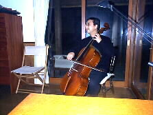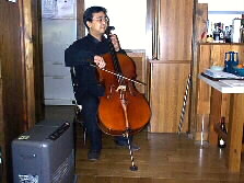 |  | バッハの無伴奏を弾いて下さいました。とても穏やかな柔らかな響きです。左手の弦を押さえる音がパチパチと聞こえる、そんなすぐ目の前で演奏を聞くことが出来感激です。 チェロは、前のゆふいん音楽祭音楽監督の黒沼俊夫氏の遺愛の楽器、1830年代製作のフランスのヴィヨーム。 | |
