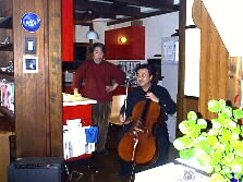 |  | バッハの時代の曲を出来るだけ当時の雰囲気に再現できたらといろいろ試みています。16世紀の終わり頃にチェロという楽器が生まれ、時代に合わせ、曲に合わせて変化をして今の形になりました。弦はバロック弦を使っています。モダーンとはこんなに違うのですよ、と実物を触らせて下さって、分かり易く説明をして下さる、河野文昭氏(右)とピアニストの美紗子夫人(左)です。 | |