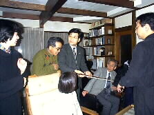 |  | 「本当はここが一番我が家ではいい音がします。」と加藤氏がキッチンとの境目あたりにイスを運びました。「ああ、なるほど、こちらの方がいい音がしますね。」ということで、電子レンジや、ふきん干しや、お鍋やシンクを背景にしたコンサートとなりました。 | |