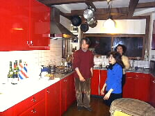 |  | 私は台所をお借りして、持ってきた材料でカナッペを作り、焼いてきたパウンドケーキを切ってパーテイーの準備をしました。この台所は、ドイツ製の真っ赤なシンクが並ぶとても素敵なキッチンです。左は加藤氏、手前は音楽祭スタッフの小野直子さんです。私は彼女の姿に憧れて音楽祭スタッフの仲間に入れて頂いたのです。とっても素敵な方です。 | |