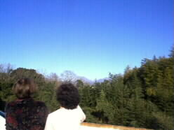 いよいよお別れの朝です。風はまだ冷たいですがとてもきれいな青空です。我が家のすぐ前の空き地から、由布岳と鶴見岳を見ました。「ここの景色が我が家のホームページのカバーの絵ですよ」と話しました。 |